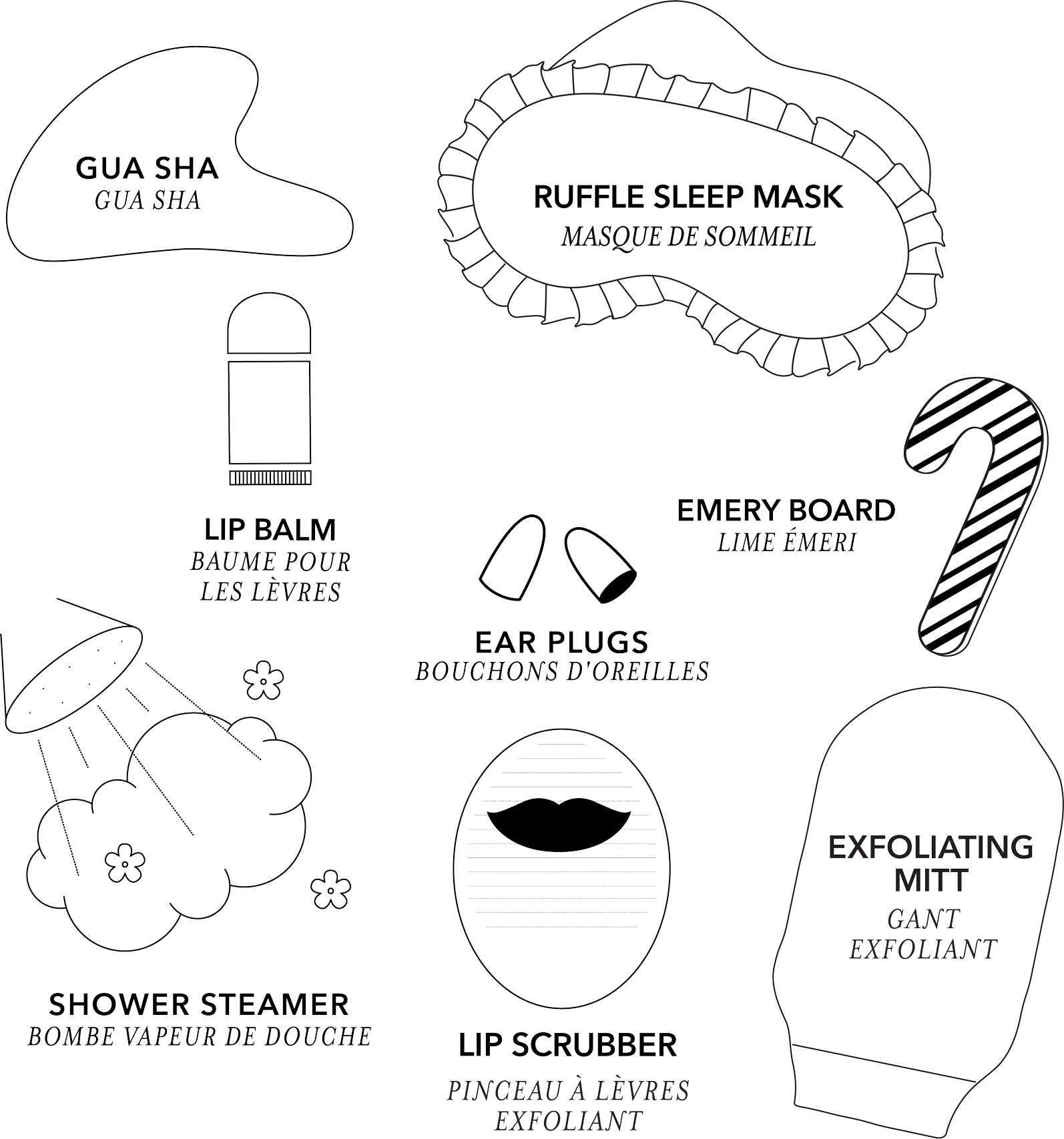 The kit includes 8 holiday-inspired self-care essentials to sleigh the season: Red ruffle sleep mask, gua sha stone, eucalyptus shower steamer, red exfoliating mitt, candy cane emery board, lip balm, earplugs, exfoliating lip scrubber.