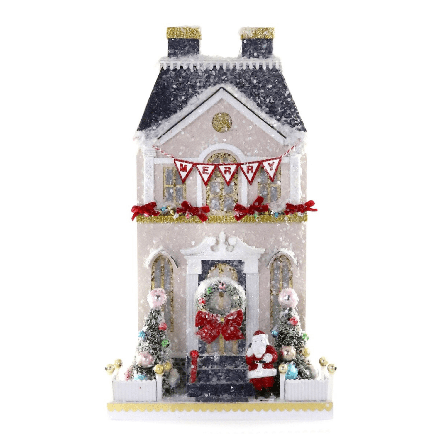 Welcome holiday cheer with the Cody Foster Merry Manor! This grand pink manor is decked in snowy sparkle, festive red bows, bottle brush trees, and a “MERRY” banner waving above the windows.