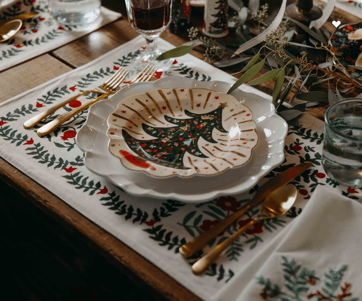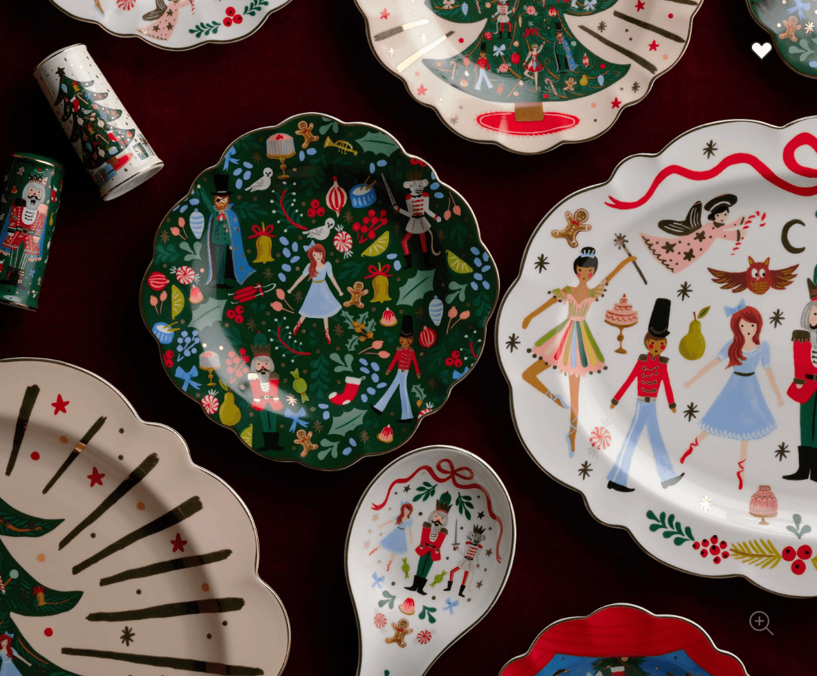 A set of four assorted dessert plates featuring four festive scenes and metallic gold foil, including a decorated tree, our favorite characters from the Nutcracker ballet, and other holiday icons.