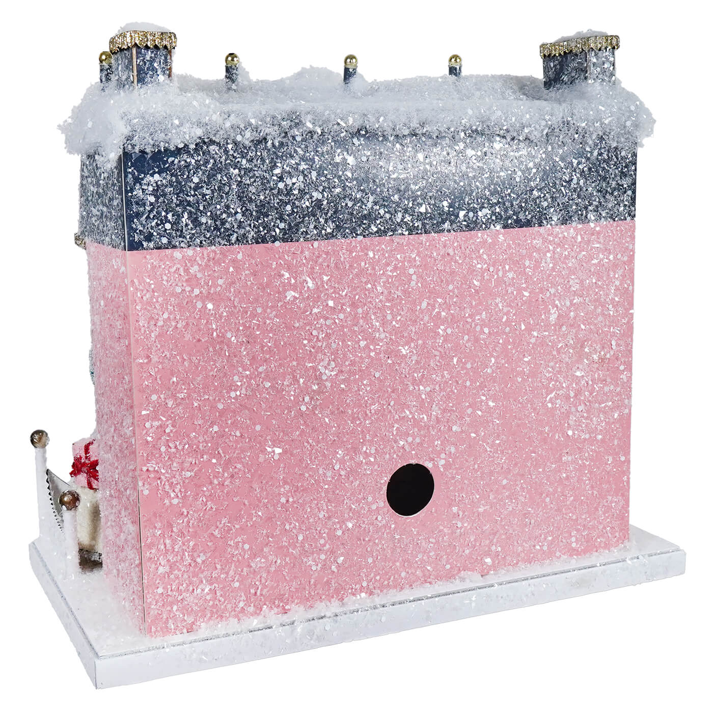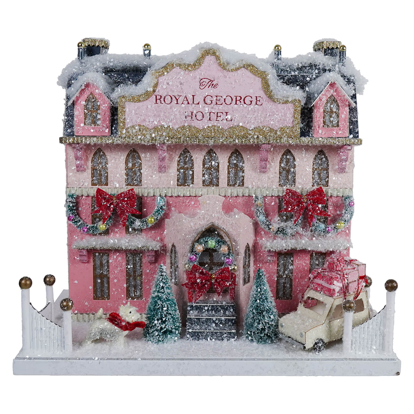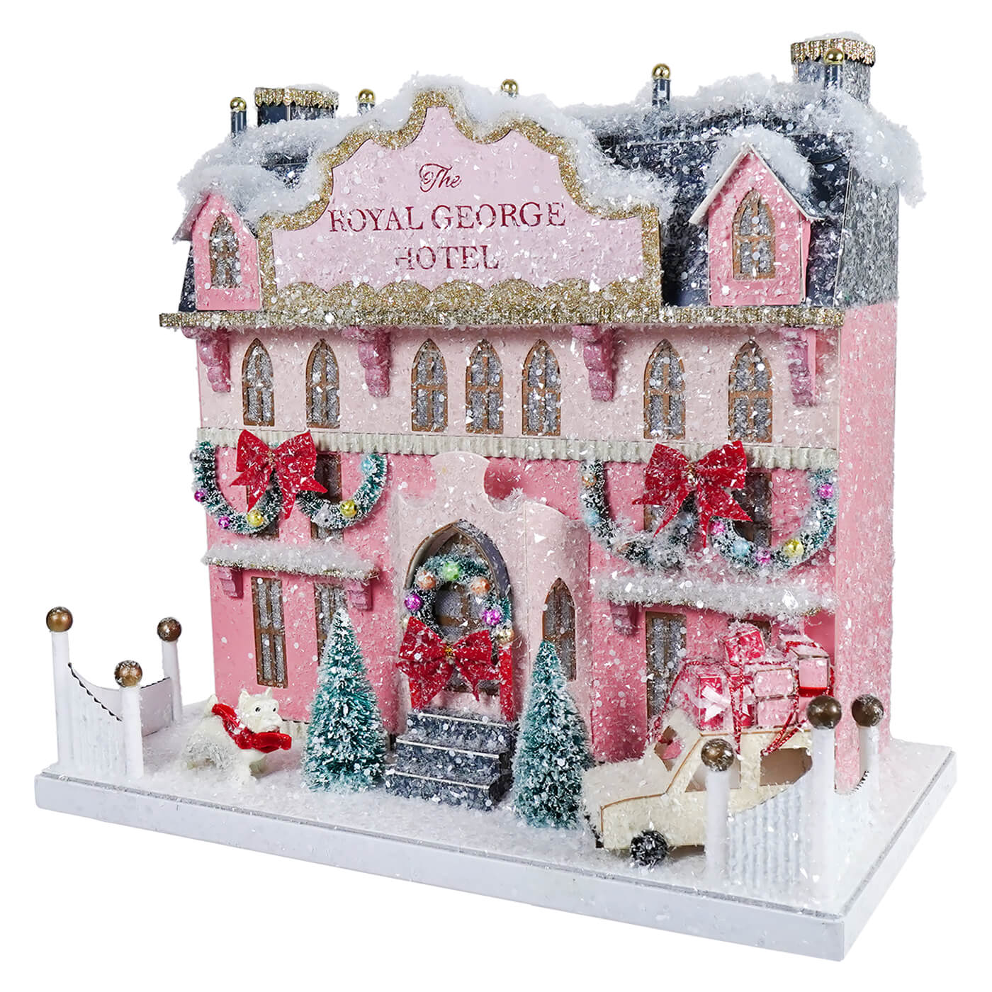 One of Cody Foster's larger village houses, this could literally be a stand a long piece surrounded by trees and a Santa or two. The Royal George Hotel stands ready to transport your Christmas village to a scene of vintage elegance. This 14.5-inch paper pulp masterpiece from Cody Foster takes inspiration from the grand hotels of old, with its soft pink exterior, frosted rooftop, and stunning attention to detail. Adorned with red bows, festive wreaths, and glittering garlands, this building is an inviting addition to your holiday décor, capturing the joy and warmth of a bustling holiday season.