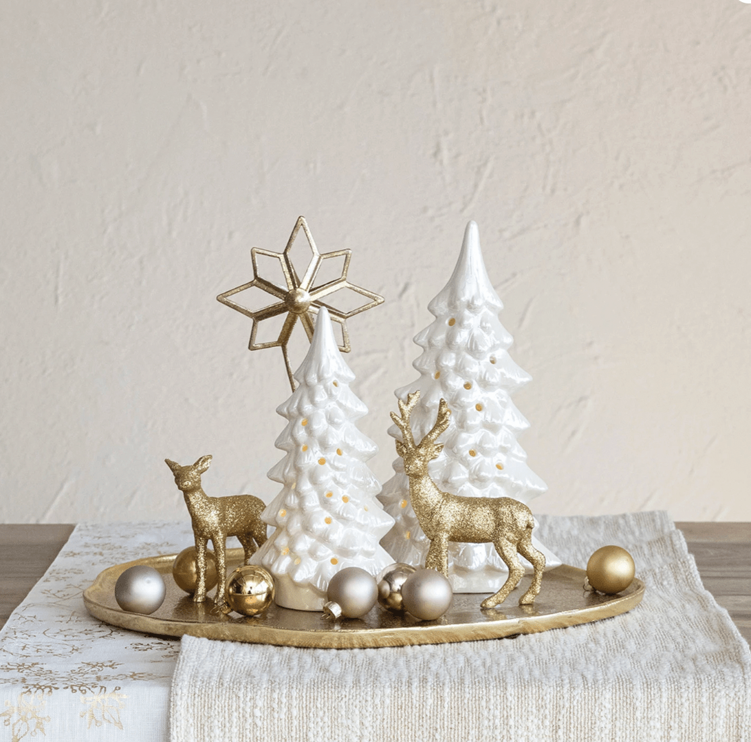 These cream stoneware LED tree with cut-outs and an iridescent finish is a lovely and luminous piece that will brighten up any space. A gentle cream color palette makes the tree pleasant and inviting. Cut-outs give texture and character to the tree, making it beautiful and unique. Lighting and warmth from an LED light make the tree beautiful and comfortable. Iridescent finishes give the tree shine and charm, giving it a gorgeous and distinctive appearance. The tree is made of stoneware and LED light, with a smooth and shiny quality. It is easy to clean and maintain. These are a versatile and stylish piece that can be displayed on a table, shelf, or mantel. It is a beautiful piece to add some light and elegance to the winter or holiday decor. A lovely and luminous cream stoneware LED tree with cut-outs and iridescent finish. A beautiful piece to add some light and elegance to the winter or holiday decor. Battery Included.