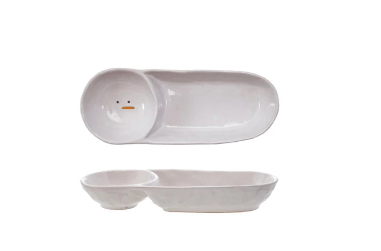 Celebrate the season with this charming Stoneware Two-Section Dish featuring a festive snowman face. Ideal for serving holiday treats or appetizers, its divided design keeps flavors separate while adding a warm, joyful touch to your gatherings. Durable and easy to care for, this dish brings holiday spirit to every meal.