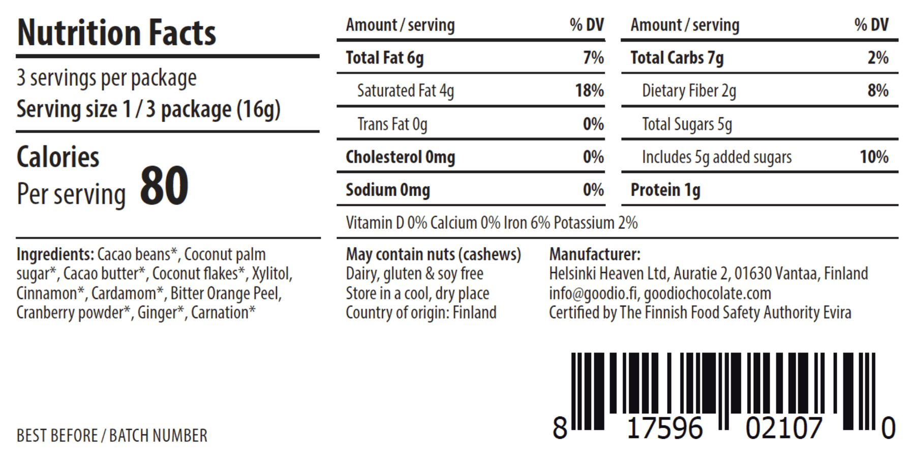 INGREDIENTS: Cacao beans*, Coconut palm sugar*, Cacao butter*, Coconut flakes*, Xylitol, Cinnamon*, Cardamom*, Bitter Orange Peel, Cranberry. *organic. Chocolate, minimum 50% cacao content.