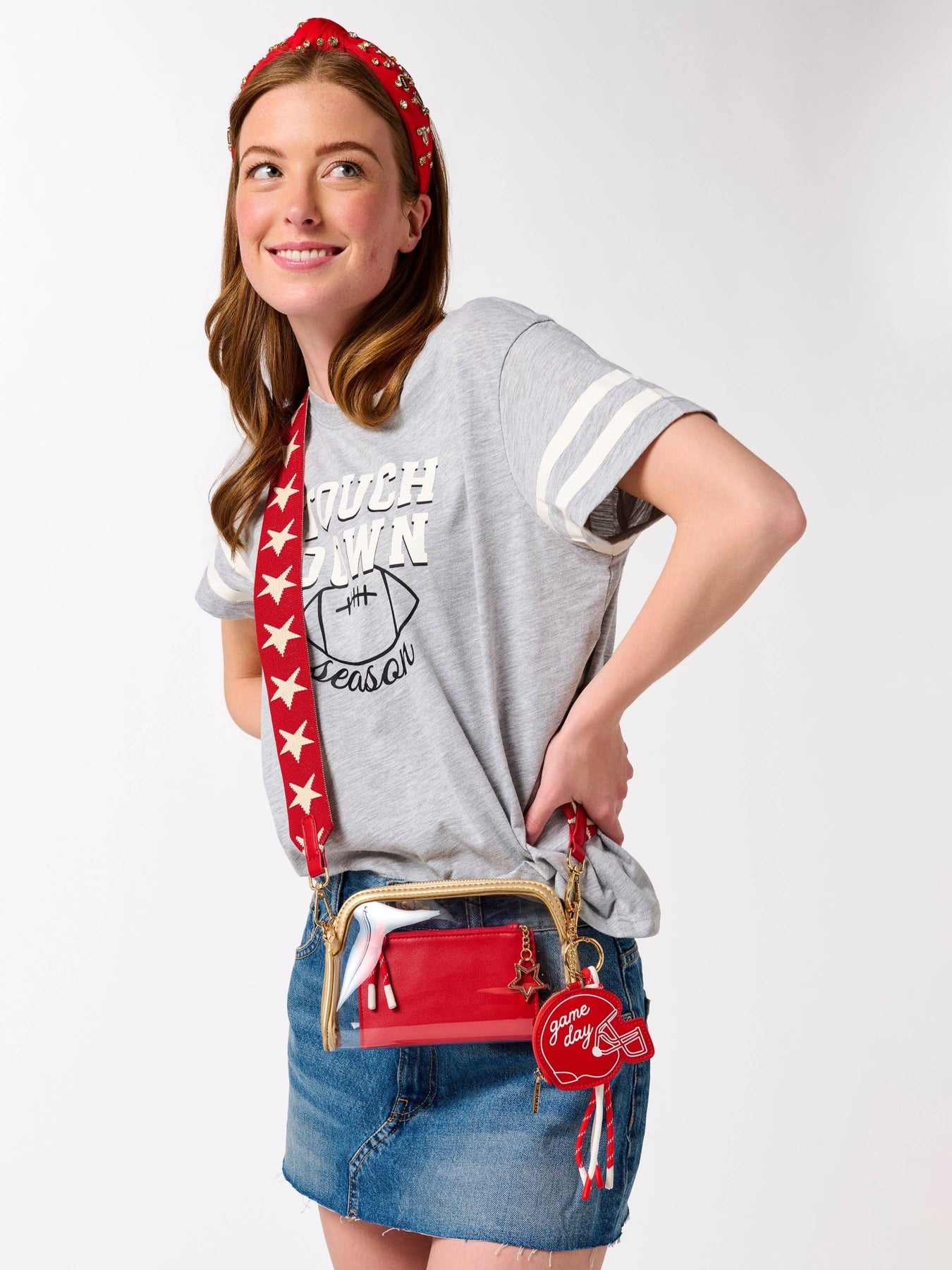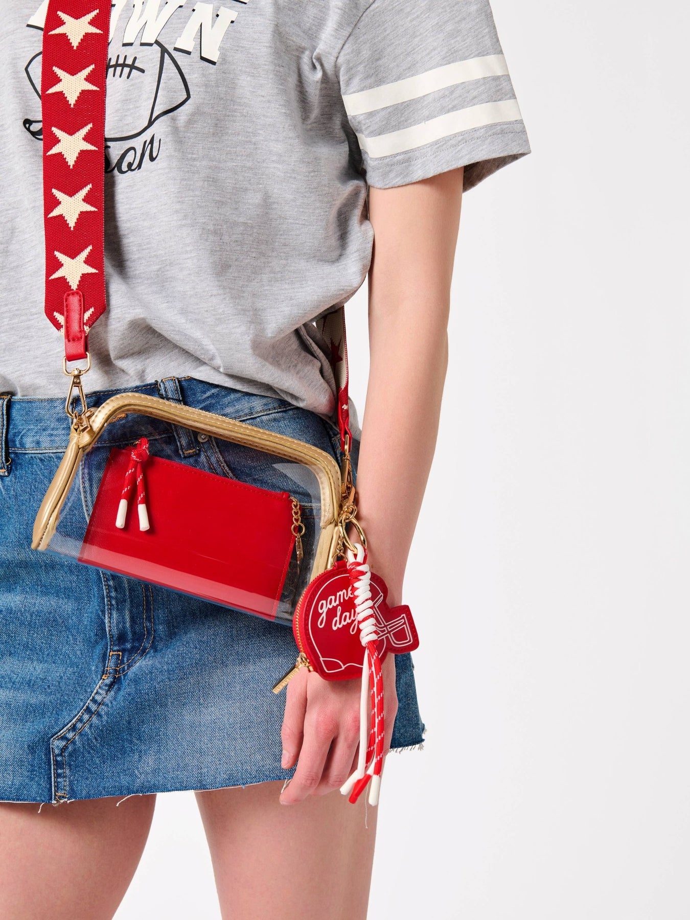 Cheer on your team in style with the Helmet Bag Charm/Key Ring — the ultimate sporty accessory for football fanatics. This fun, helmet-shaped pouch features a top zip closure to stash small essentials, and comes with a key ring and clasp hook so you can attach it to any bag or set of keys. The bold “Game Day” lettering and matching tassel cord give it extra spirit and flair. Whether you're tailgating or just running errands, this charm brings major game day energy. Made from PU with gold hardware.