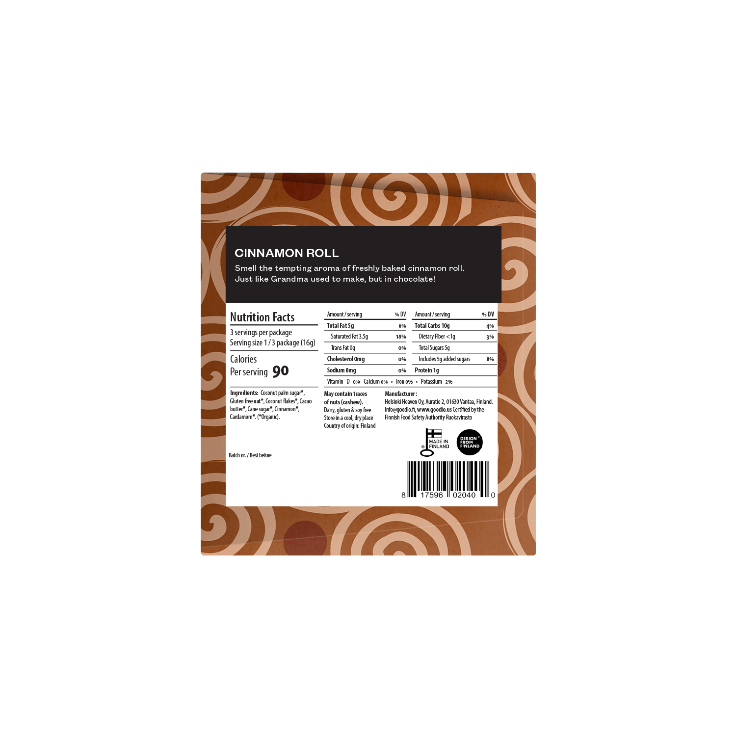 INGREDIENTS: Coconut palm sugar*, Gluten free oat*, Coconut flakes*, Cacao butter*, Cane sugar*, Cinnamon*, Cardamom*. (*Organic). May contain traces of nuts (cashew). Store in a cool, dry place. Dairy-free, gluten-free and soy-free. Net weight: 48g This bar is proudly handmade with love in Finland - the happiest country in the world by Goodio Chocolate Artists.